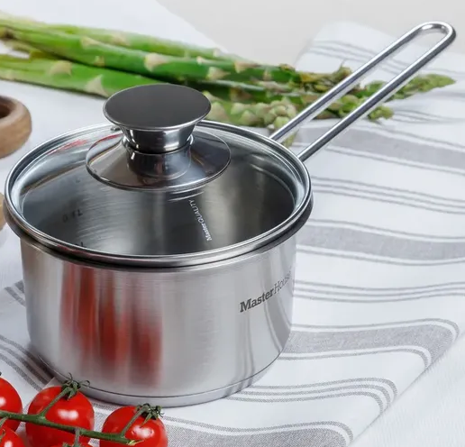 Ковш со стеклянной крышкой 0,8 л. Идеален для приготовления маленьких порций блюд (детская каша, соус). Капсулированное дно с алюминиевой вставкой. Крышка из термостойкого стекла с отверстием для пара и ободком из нержавеющей стали