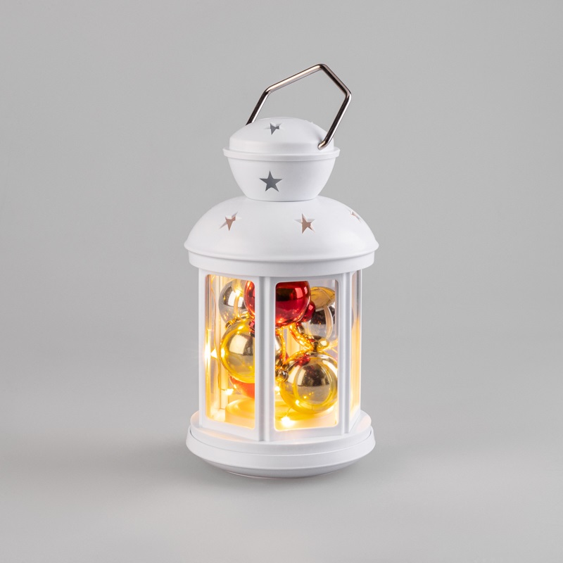 Декоративный фонарь представляет собой корпус белого цвета аутентичного исполнения, за стеклом находятся небольшие елочные шарики, подсвечиваемые диодной мини-гирляндой. 12 диодов излучают теплый белый свет и питаются от 2 батареек типа АА. Металлизированная глянцевая поверхность шариков эффектно играет в световом потоке, отбрасывая яркие блики на окружающие предметы. Светодиоды экономичны, безопасны и долговечны. Фонарь с шариками станет великолепным украшением праздничного и повседневного интерьера.